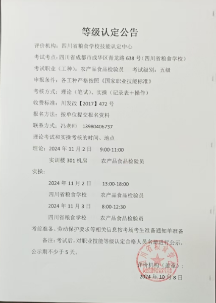 四川省粮食学校20241102-03期农产品食品检验员初级认定通知